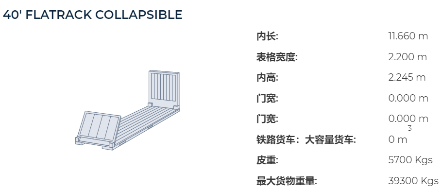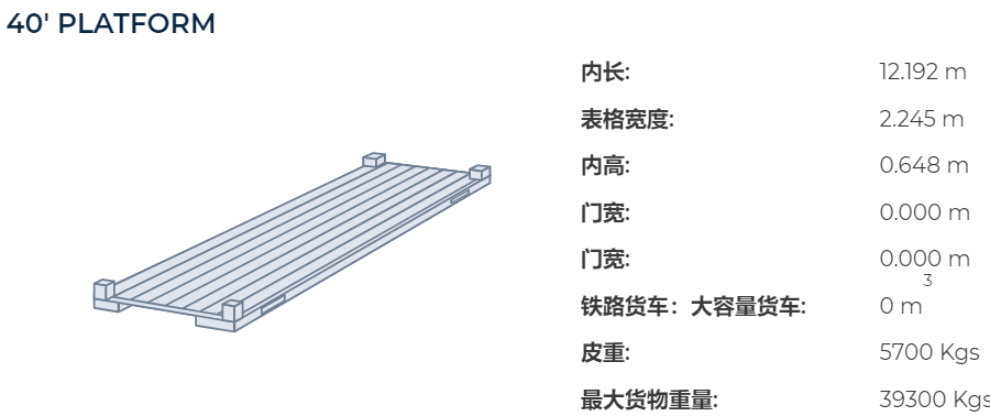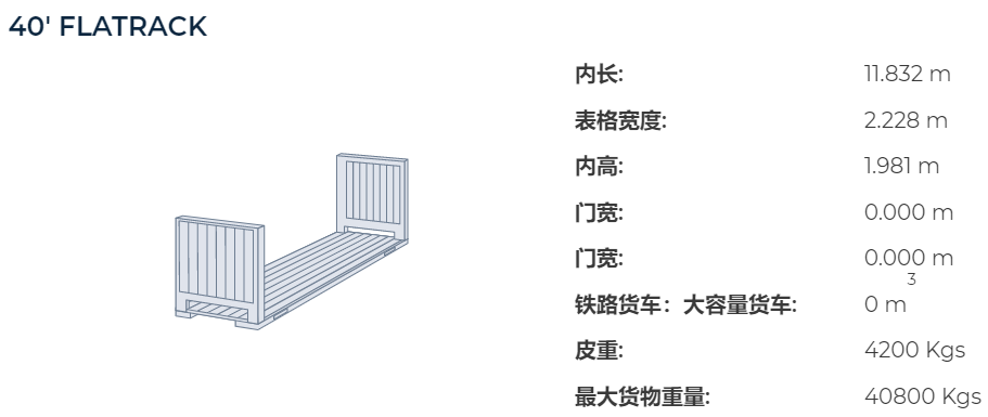 40尺平底貨柜:內(nèi)容積為 12.05M * 2.12M * 1.96M, 配貨毛重一般為36噸, 體積為50立方米。